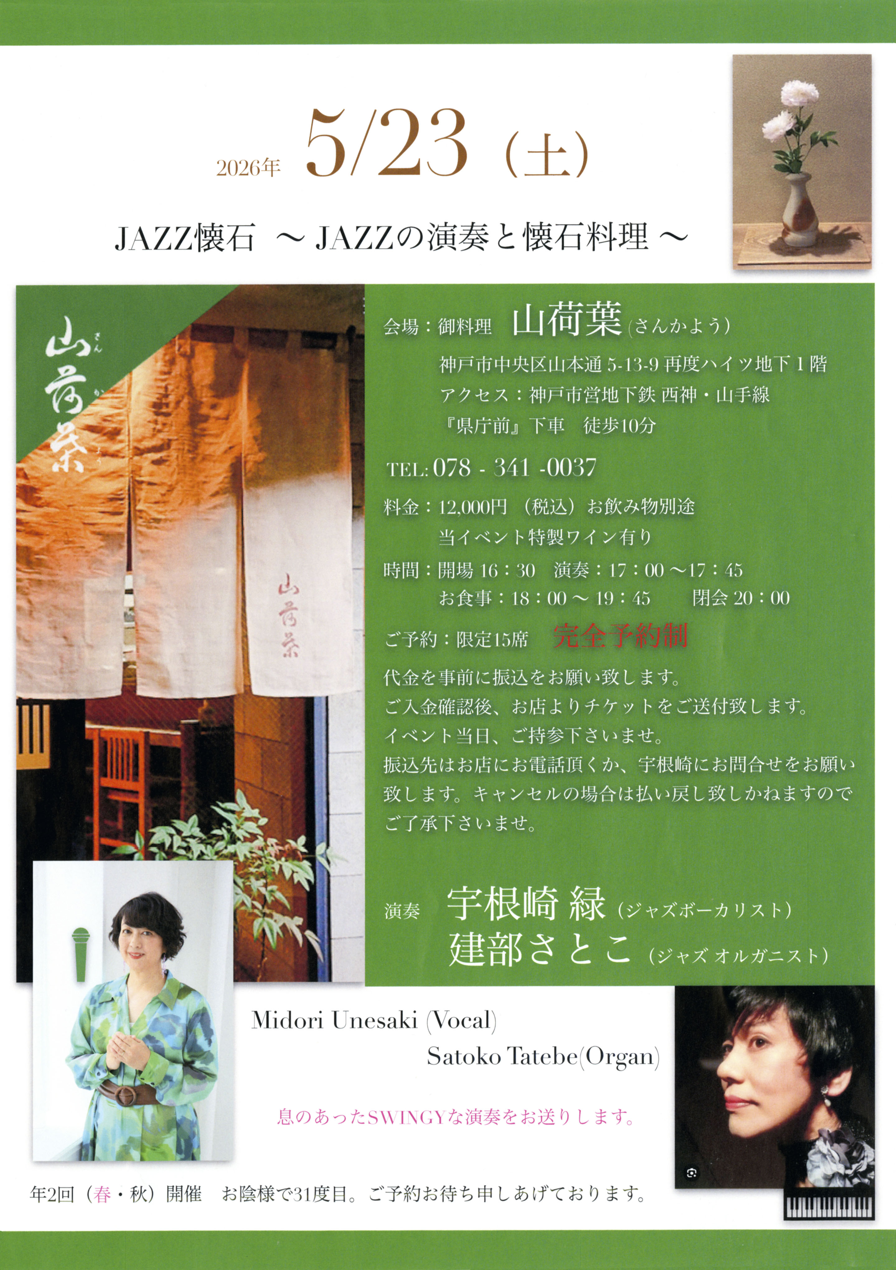 JAZZ懐石 ~JAZZの演奏と懐石料理~日時:2026年5月23日(土)17:00~20:00会場:山荷葉料金:12,000(税込)お飲み物別途完全予約制